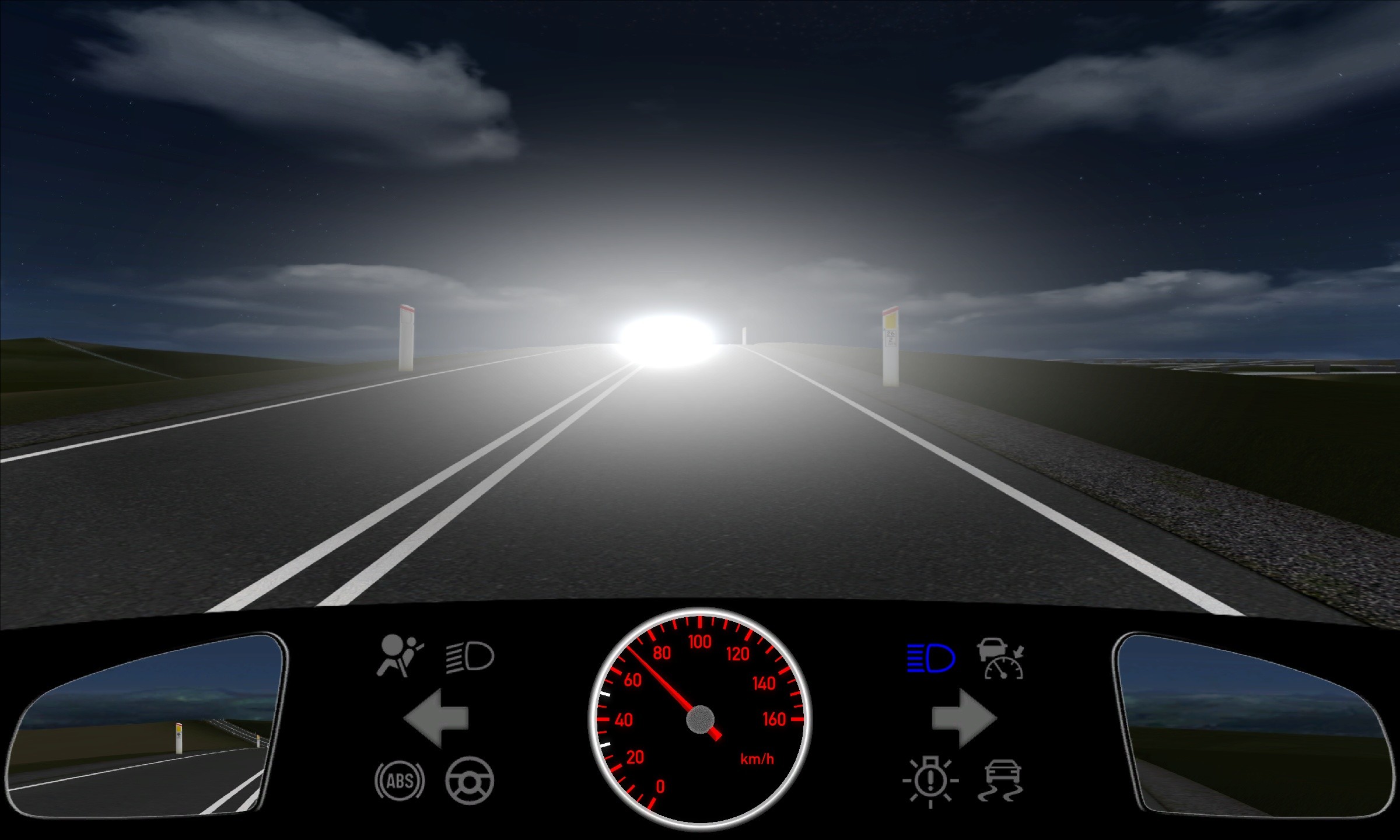 I denne gratis kørekort test skal du vurdere, hvordan du fortsætter i mørke, når du kører 70 km/t med det lange lys tændt. Opgaven handler om korrekt hastighedstilpasning og nedblænding for at undgå at blænde modkørende.