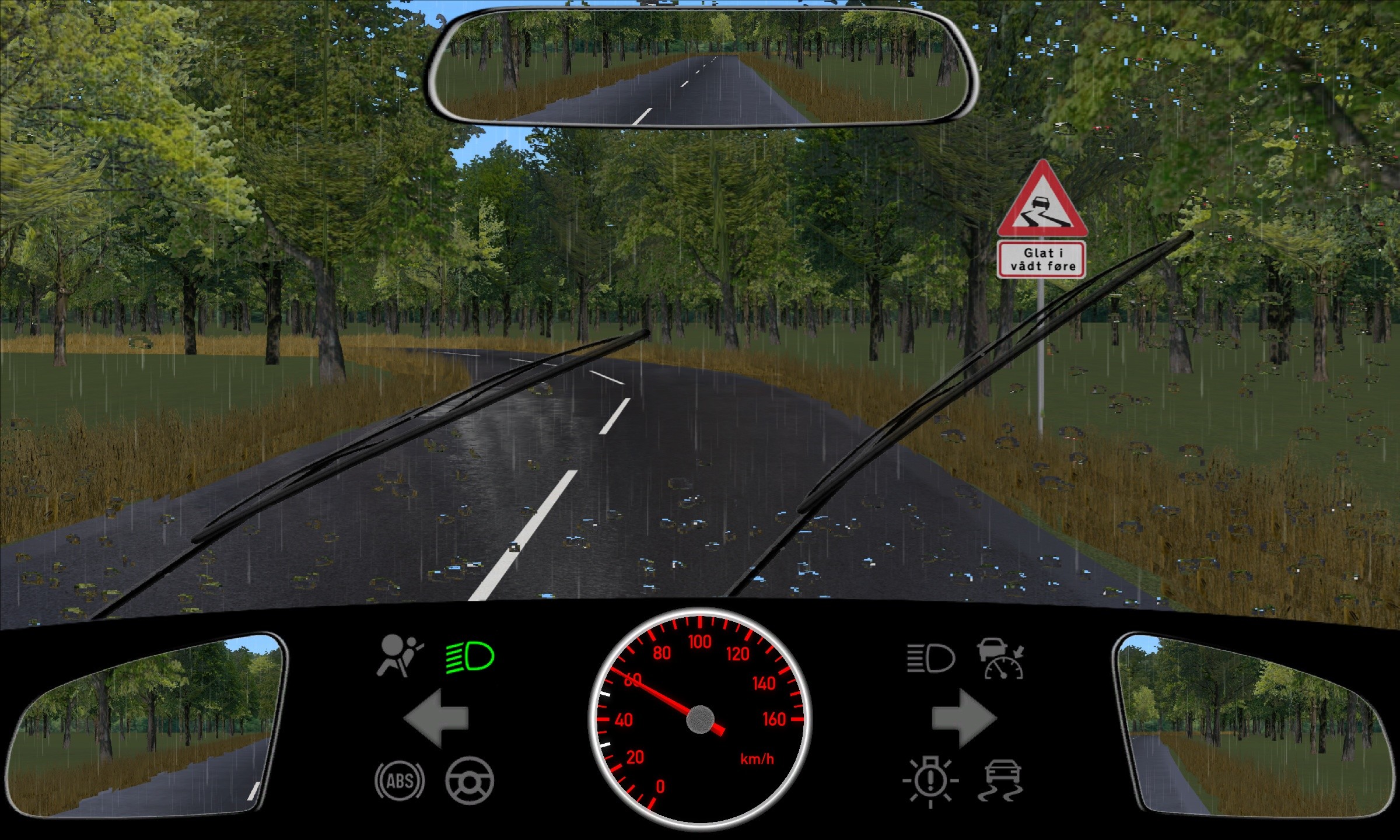 Denne side viser et eksempel på et spørgsmål, der ofte indgår i teoriproeve tests, hvor du skal reagere korrekt ved pludseligt regnvejr og risiko for glat føre.